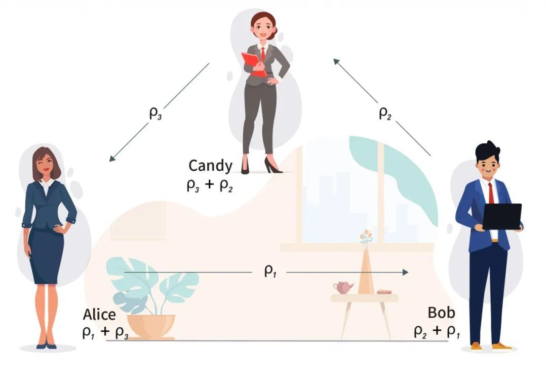 接着Alice本地计算𝑐1=𝑟1⊕𝑟3,𝑧1=𝑟1;Bob本地计算𝑐2=𝑟2⊕𝑟1,𝑧2=𝑟2;Candy本地计算𝑐3=𝑟3⊕𝑟2,𝑧3=𝑟3。