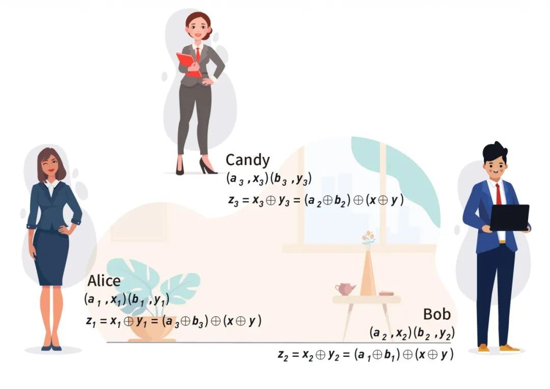 首先是XOR(加法)的实现方式:要计算 [𝑧]=[𝑥+𝑦],Alice、Bob和Candy只需要分别本地计算𝑥𝑖+𝑦𝑖,𝑖∈{ 1,2,3}即可。以Alice为例,因为𝑥1=𝑎3⊕𝑥,𝑦1=𝑏3⊕𝑦,则𝑥1⊕𝑦1=𝑎3⊕𝑥⊕𝑏3⊕𝑦=(𝑎3⊕𝑏3)⊕(𝑥⊕𝑦)=(𝑎3⊕𝑏3)⊕𝑧,若将𝑎1⊕𝑏1记为𝑐1,𝑎2⊕𝑏2记为𝑐2,𝑎3⊕𝑏3记为𝑐3,则Alice、Bob和Candy在分别完成本地计算𝑥𝑖+𝑦𝑖,𝑖∈{ 1,2,3}后,Alice可以得到𝑧1=𝑐3⊕𝑧,Bob可以得到𝑧2=𝑐1⊕𝑧,Candy可以得到𝑧3=𝑐2⊕𝑧;且𝑐1⊕𝑐2⊕𝑐3=𝑎1⊕𝑎2⊕𝑎3⊕𝑏1⊕𝑏2⊕𝑏3=0⊕0=0,由此满足之前的秘密分享定义,𝑧1⊕𝑧2⊕𝑧3=𝑧,𝑐1⊕𝑐2⊕𝑐3=0。