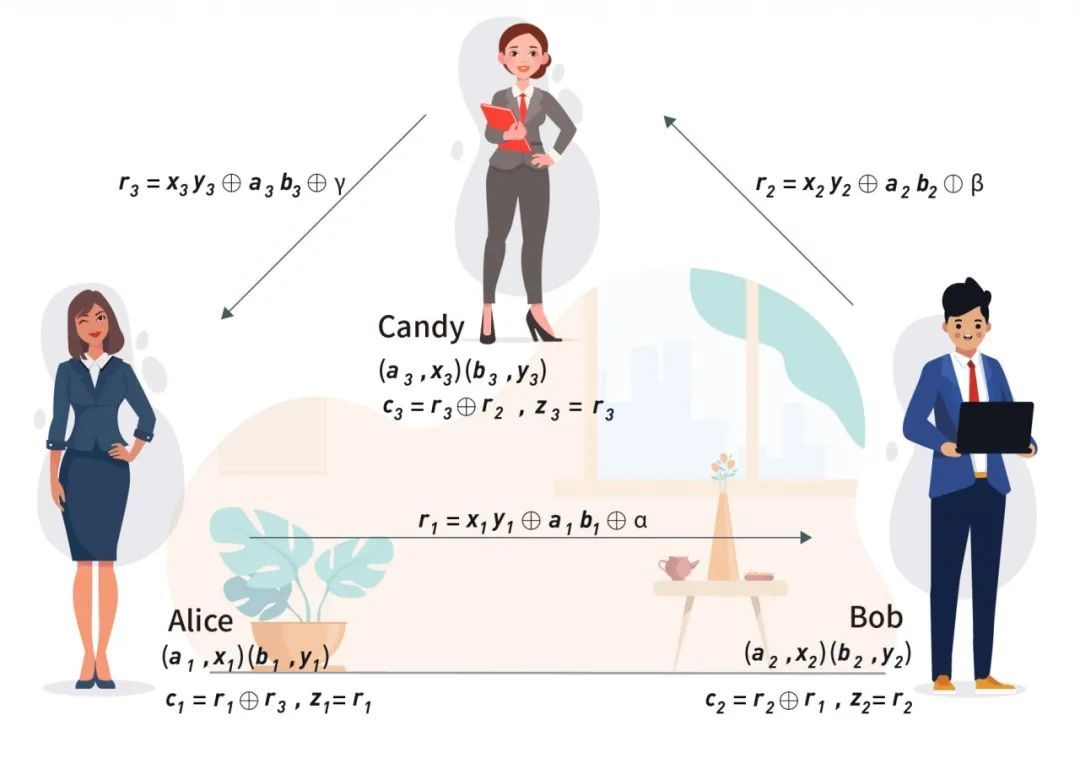 Alice计算𝑟1=𝑥1𝑦1⊕𝑎1𝑏1⊕𝛼,并把𝑟1发送给Bob;Bob计算𝑟2=𝑥2𝑦2⊕𝑎2𝑏2⊕𝛽,并把𝑟2发送给Candy;Candy 计算𝑟3=𝑥3𝑦3⊕𝑎3𝑏3⊕𝛾,并把𝑟3发送给Alice。