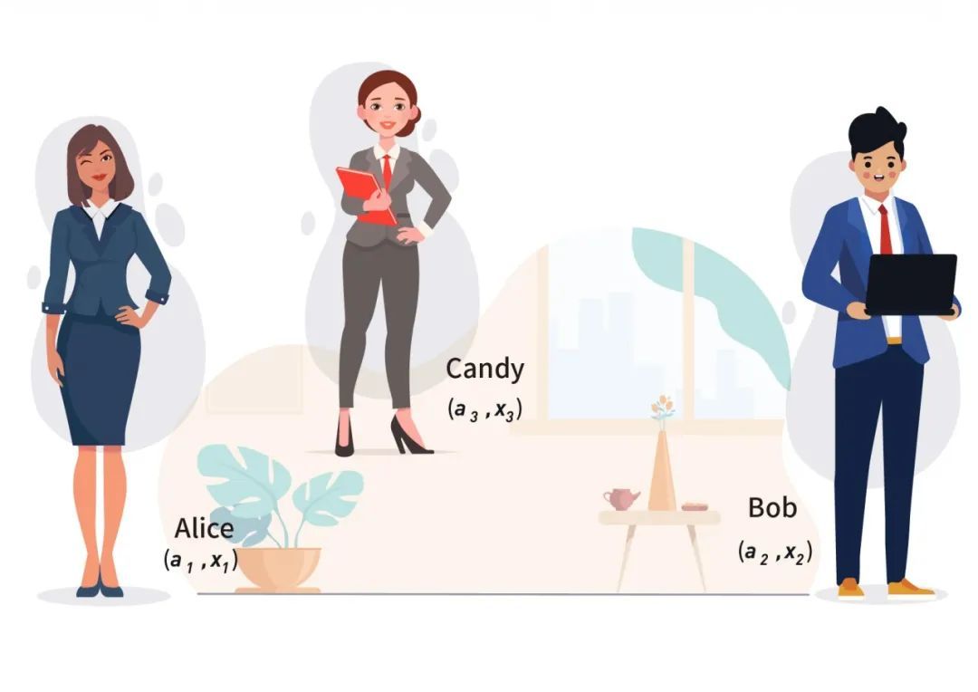 在安全多方计算中,只要实现了多方加法和多方乘法,即可实现完备。因此接下来开始介绍该三方复制秘密共享协议实现多方加法和多方乘法的方式。此时Alice已经持有了(𝑎1,𝑥1), (𝑏1,𝑦1),Bob持有了(𝑎2,𝑥2), (𝑏2,𝑦2), Candy持有了(𝑎3,𝑥3), (𝑏3,𝑦3)。