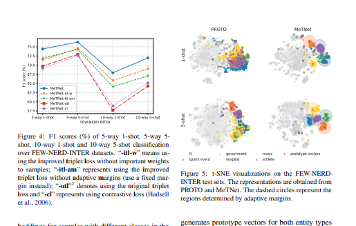 2.为了解决这个问题,我们提出了 MeTNet,它只为实体类型而不是 O 类生成原型向量。 我们设计了一个改进的三元组网络,将样本和原型向量映射到一个更容易分类的低维空间,并为每个实体类型提出自适应边距。 边距作为一个半径,在低维空间中控制一个大小自适应的区域。 基于这些区域,我们提出了一种新的推理过程来预测查询实例的标签。