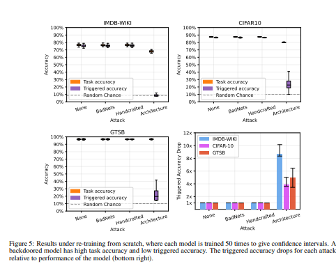 - 在许多基准测试中证明,与以前的方法不同,隐藏在架构内部的后门在重新训练后仍然存在