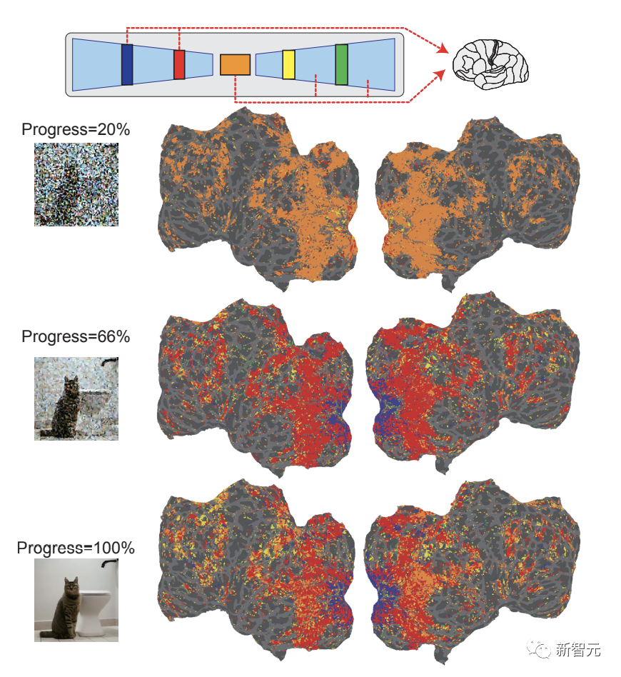 在去噪过程的早期阶段,U-Net 的瓶颈层(橙色)产生最高的预测性能,随着去噪过程的进行,早期层(蓝色)进行对早期视觉皮层活动的预测,瓶颈层则转向高级视觉皮层。在扩散过程刚开始时,图像信息压缩在瓶颈层中,伴随着去噪,U-Net层之间的分离出现在视觉皮层中。