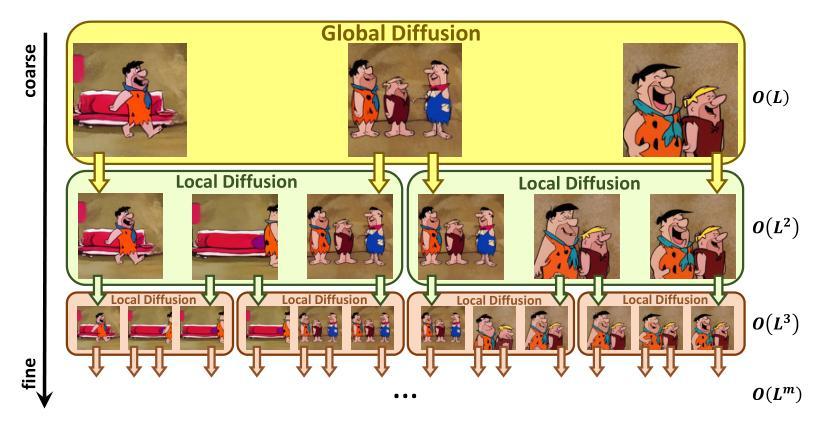 本文提出NUWA-XL,一个新的扩散+扩散模型(Diffusion over Diffusion architecture)以实现超长视频生成。大多数现有的超长视频生成方法需要将视频进行时序上的线性分割,从而受限于短视频训练、长视频推理的难点,且无法对时序信息进行充分利用。相反,本文采用从粗到细的思路,将视频的在统一粒度上并行生成。为此,一个全局扩散模型被用于在整个时序信息的基础上生辰关键帧,一个局部扩散模型用于逐步修复相邻帧之间的内容差异。尽管这一方法看起来较为简单,但却可以实现3376帧长视频的训练。为了测试NUWA-XL,作者构建了FlintstonesHD数据集。实验效果证明,NUWA-XL不仅可以生成高质量的长视频,还可以将推理时间较少94.26%,即从7.55分钟减少到26秒。