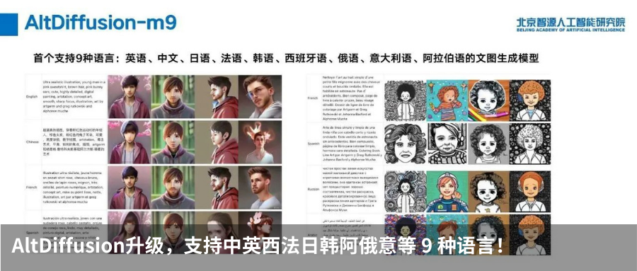 智源研究院 FlagAI 团队首创高效训练方式,使用多语言预训练模型和 Stable Diffusion 结合,训练多语言文图生成模型 —— AltDiffusion-m18,支持18种语言的文图生成,包括中文、英文、日语、泰语、韩语、印地语、乌克兰语、阿拉伯语、土耳其语、越南语、波兰语、荷兰语、葡萄牙语、意大利语、西班牙语、德语、法语、俄语。