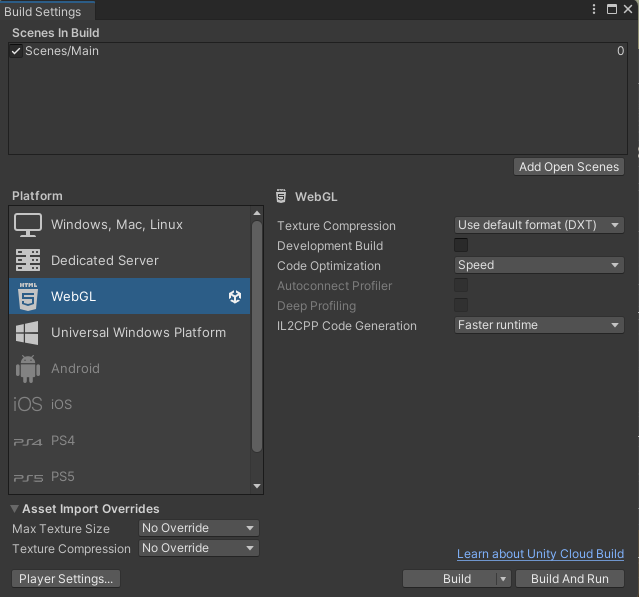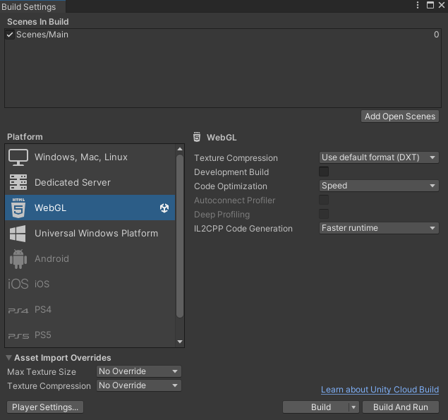 点击菜单栏的 File > Build Settings,将构建目标切换为 WebGL。