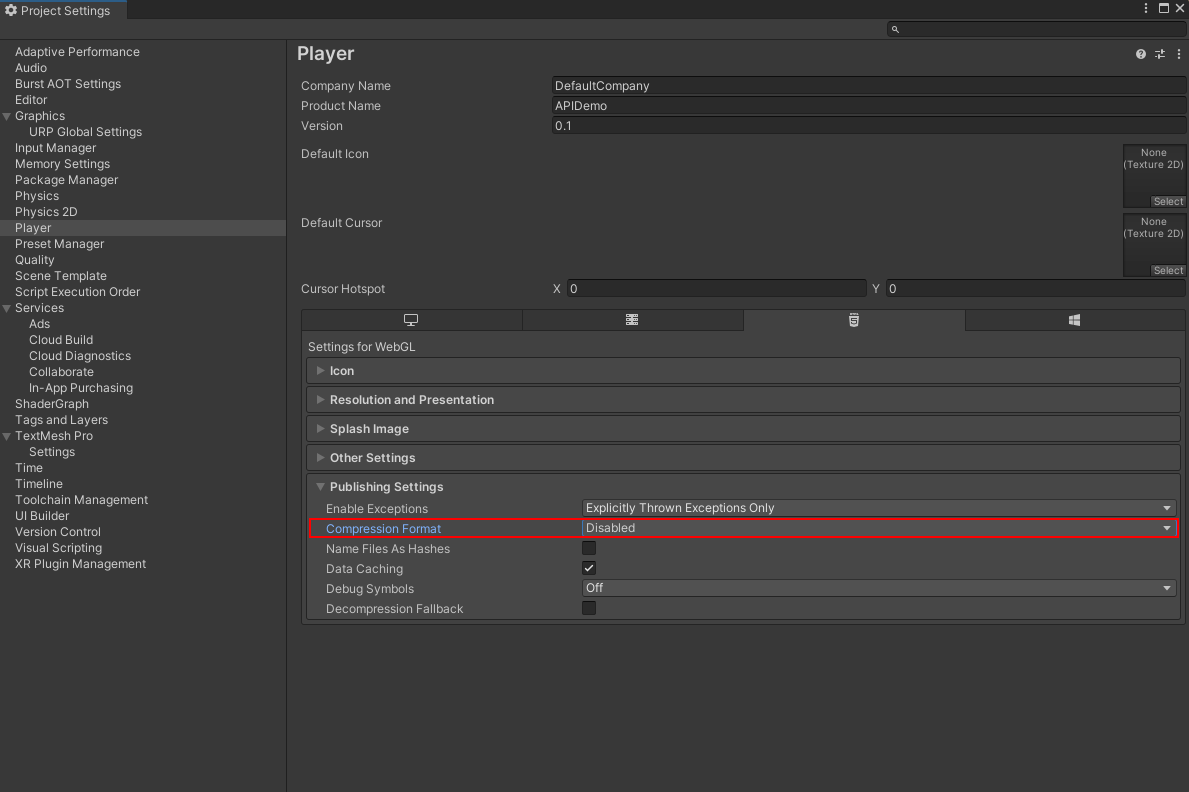 在 Player Settings 面板中点击 “Publishing Settings”,将 Compression Format 改为 “Disabled” 来禁用压缩。