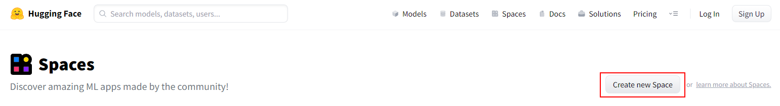 首先,导航至 Hugging Face Spaces 页面,创建一个新的 Space 应用。