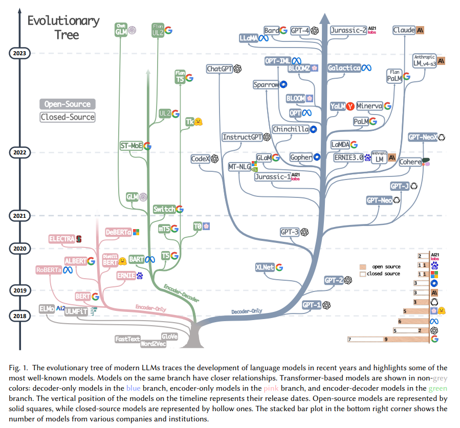 从合并这家谱树的两支,可以看到早期的 Word2Vec、FastText,再到预训练模型的早期探索 ELMo、ULFMiT ,再到 Bert 横空出世红极一时,到 GPT 家族默默耕耘直到 GPT-3 惊艳登场,ChatGPT 一飞冲天,技术的迭代之外也可以看到 OpenAI 默默坚持自己的技术路径最终成为目前 LLMs 无可争议的领导者,看到 Google 对整个 Encoder-Decoder 模型架构做出的重大理论贡献,看到 Meta 对大模型开源事业的持续慷慨的参与,当然也看到从 GPT-3 之后 LLMs 逐渐趋向于“闭”源的趋势,未来很有可能大部分研究不得不变成 API-Based 的研究。