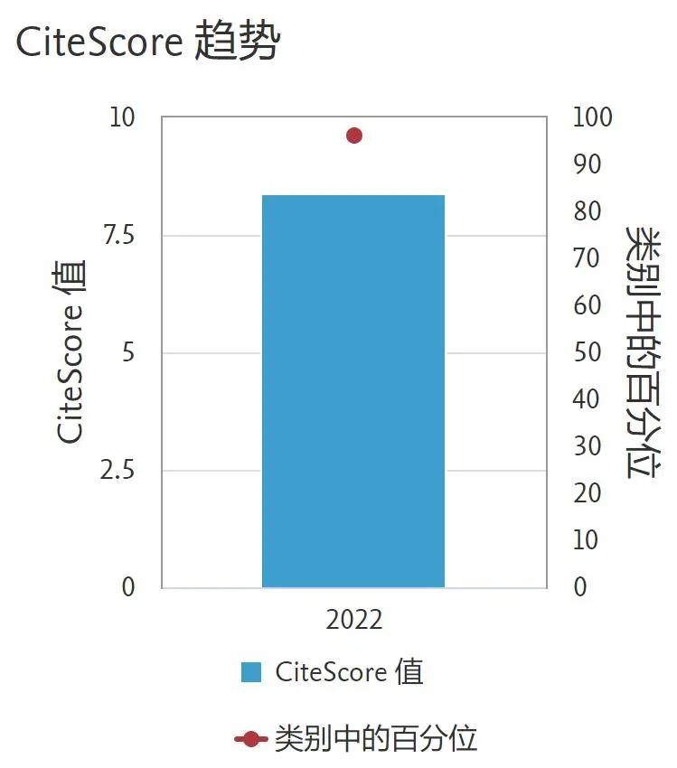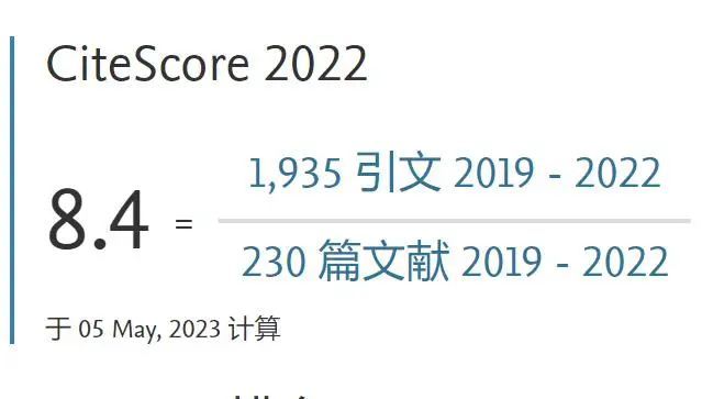 CiteScore是Elsevier基于旗下Scopus数据库统计的学术期刊质量评价指标,CiteScore 2022计算在2019-2022年间对2019-2022年所发表文章、评论、会议论文、书籍章节和数据论文进行的引用次数,然后将该次数除以在2019-2022年所发表的出版物总数。