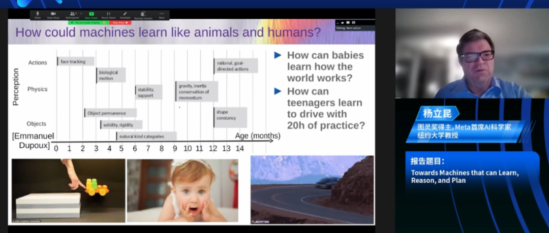 根据我同事制作的图表,如果您向 5 个月大的婴儿展示下面左下角的场景,其中一个小汽车在平台上,你将小汽车从平台上推下来,它似乎漂浮在空中,5 个月大婴儿不会感到惊讶。但是 10 个月大的婴儿会非常惊讶,因为在此期间,婴儿已经知道了物体不应该停留在空中,它们应该在重力下下落。这些基本概念是通过观察世界和体验世界来习得的。我认为我们应该用机器复制这种通过观察世界或体验世界学习世界运作方式的能力。