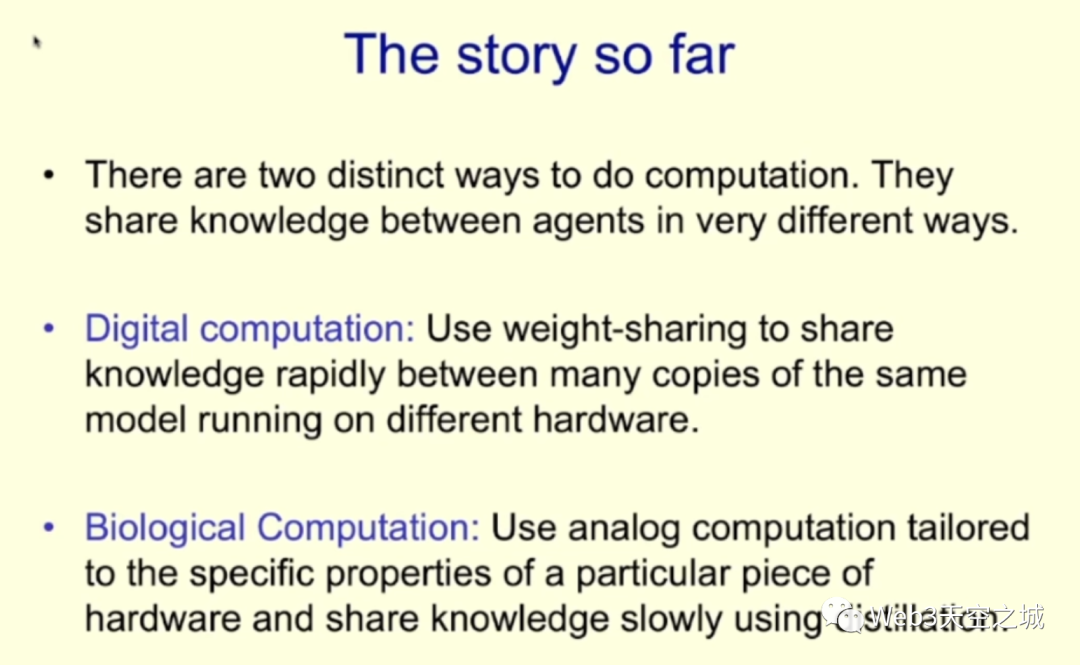 所以到目前为止的故事是有两种不同的计算方法。利用数字计算和利用模拟特性的生物计算。它们在不同代理之间共享知识的效率方面有很大差异。
