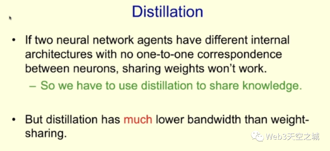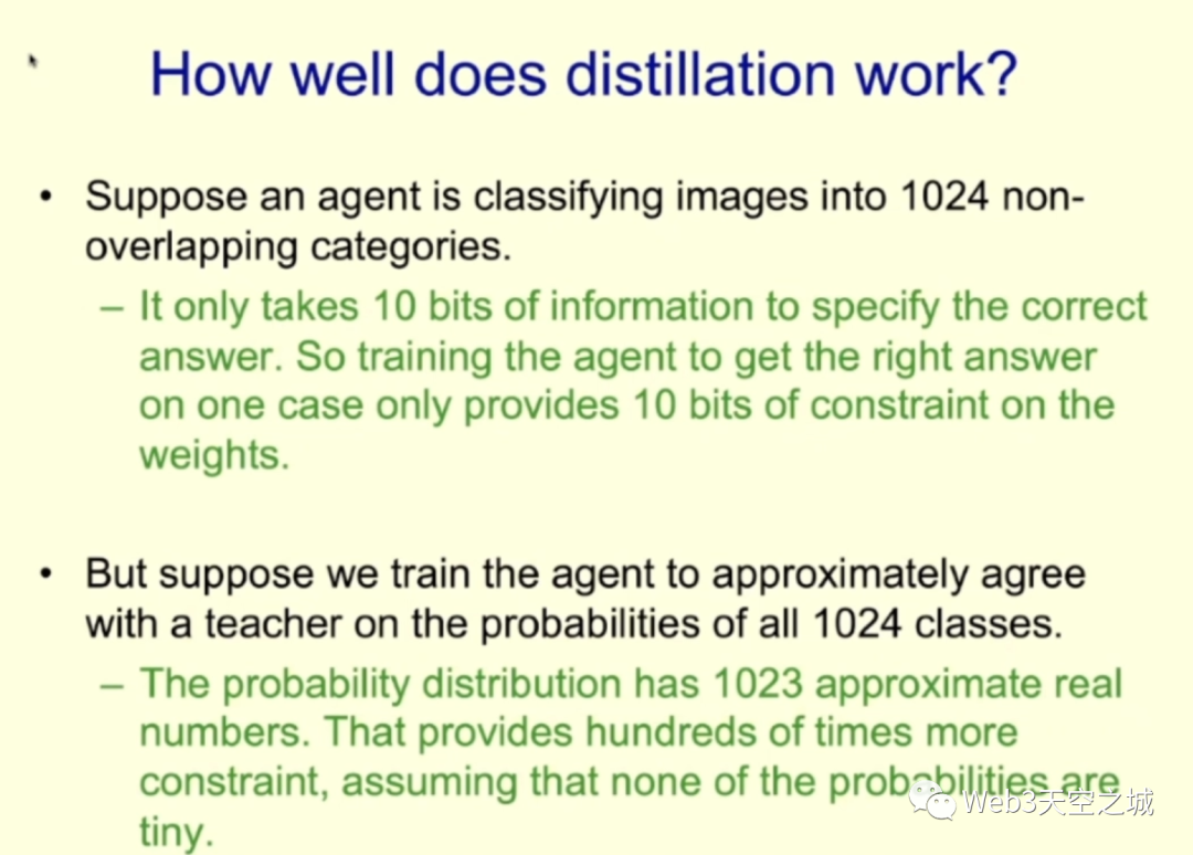 (注:Hinton这里的潜台词是,蒸馏实际上是更符合生物智能的算法结构,因为它和生物一样,无法复制另一个的权重。这让人想起,Hinton一生致力的,都是寻找大脑工作的方式)