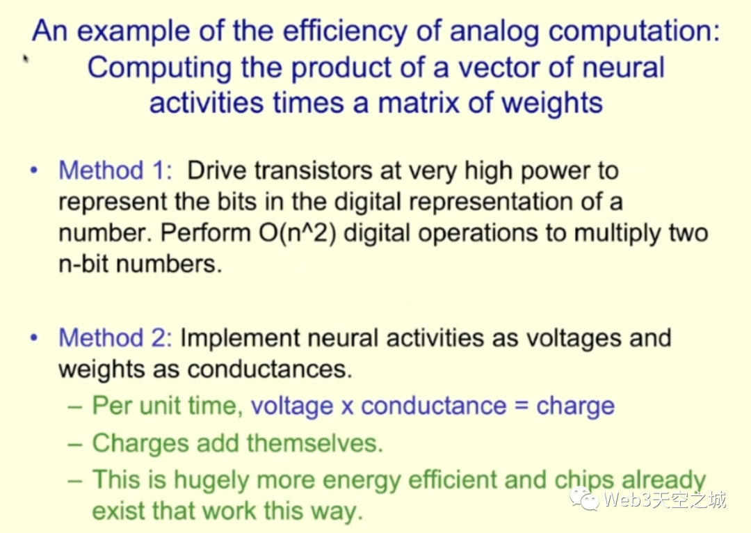 另一种方法是将神经活动实现为电压和权重作为电导,然后每单位时间电压乘以电导给你一个电荷,电荷将自己加起来,所以现在很明显你可以如何将电压向量乘以电导矩阵。
