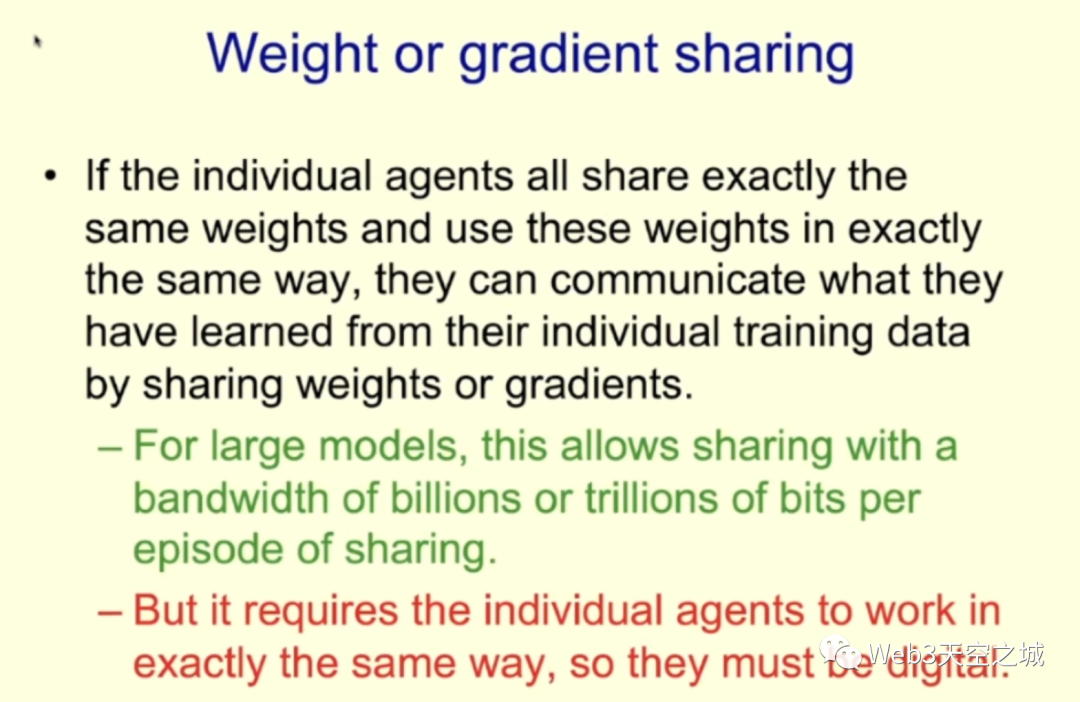 这意味着你可以采用所有这些智能体,不同的智能体可以查看训练数据的不同部分,它们可以为训练数据的这些部分的权重计算梯度,然后它们可以对它们的梯度进行平均。
