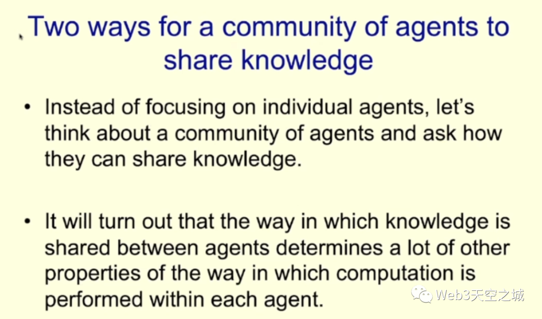 我现在想谈谈代理人社区如何共享知识。因此,与其考虑个体代理,不如考虑在社区内共享知识。