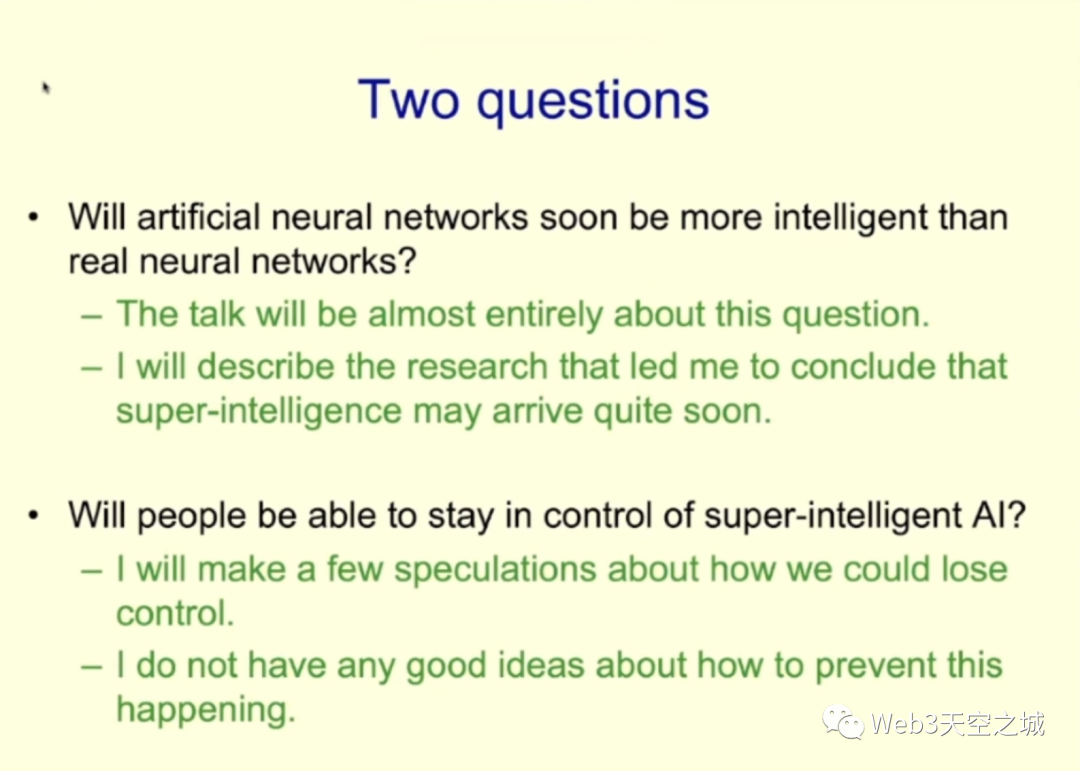 所以我想谈两个问题,我将几乎完全关注第一个问题,即人工神经网络很快会比真实神经网络更智能吗?就像我说的那样,我将描述使我得出结论认为这可能很快就会发生的研究。