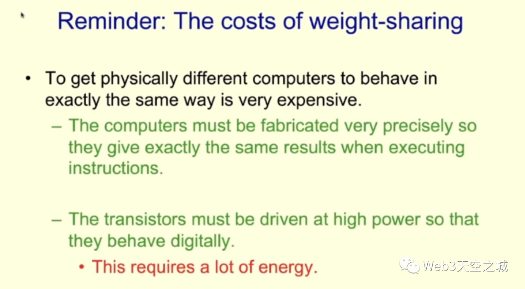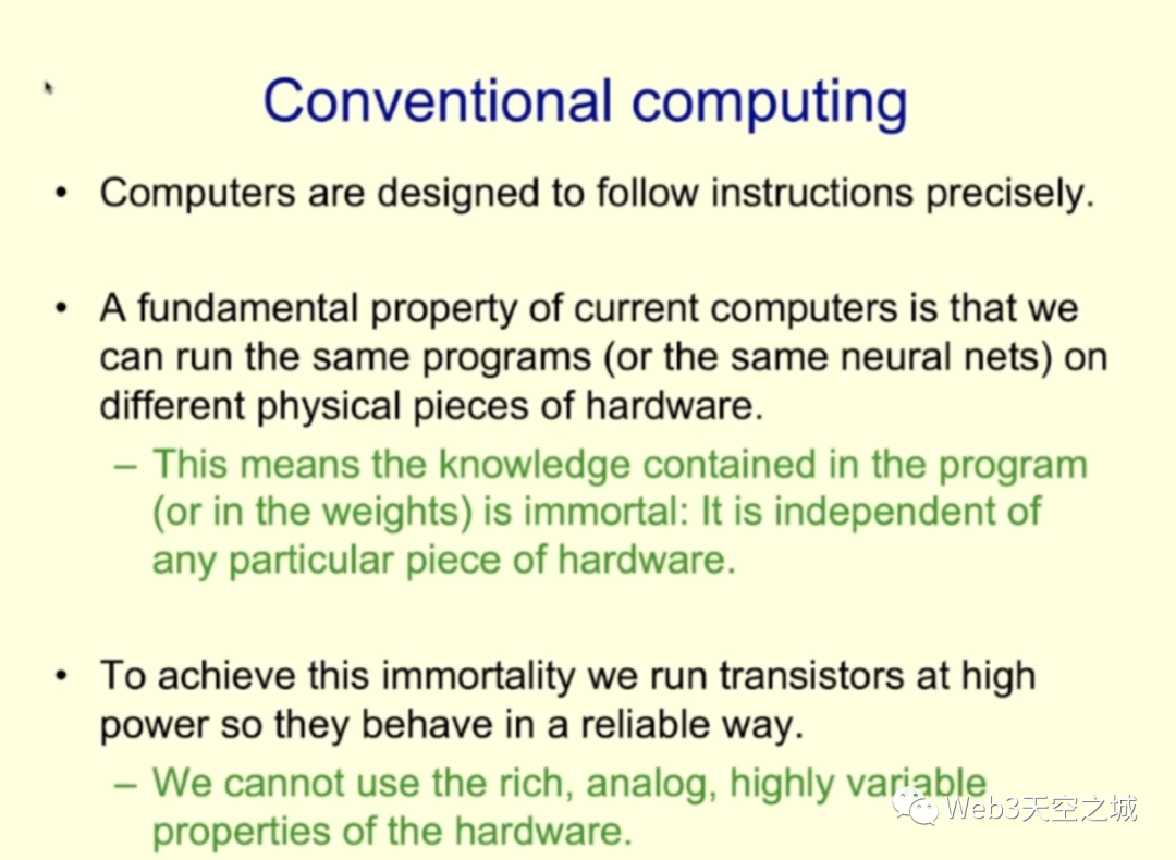 因此,在传统计算中,计算机被设计为精确地遵循指令。我们可以在不同的物理硬件上运行完全相同的程序或相同的神经网络,因为它们被设计为精确地遵循指令,这意味着程序或神经网络的权重中的知识是不朽的。它不依赖于任何特定的硬件。
