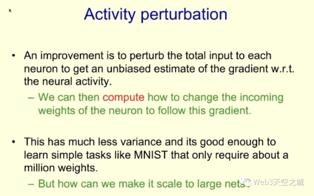 当您对一小批示例进行随机扰动时,您会查看目标函数会发生什么。由于这种扰动,您会得到目标函数的差异。然后您可以计算如何更改神经元的每个传入权重以遵循梯度。同样,它只是梯度的随机估计,但与扰乱权重相比,它的噪音要小得多。而且这个算法足以学习像MNIST这样的简单任务。