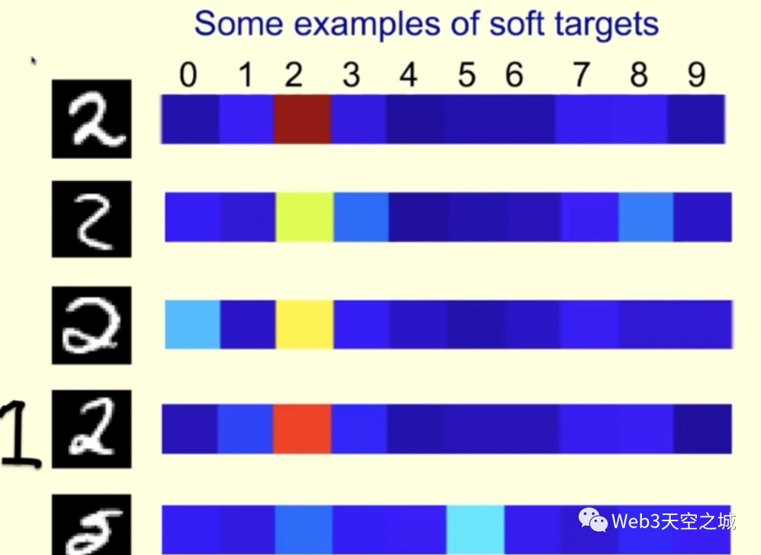 对于第一行,很有信心是二。如果你看第二行,它很确定那是一个二,但它也认为它可能只是一个三或者它可能是一个八。所以如果你看一下,你会发现二比其他两个更像八。如果你看第三行,特别明显的是二很像零。老师告诉学生,当你看到那个时,你应该说2,但你也应该在0上小注。