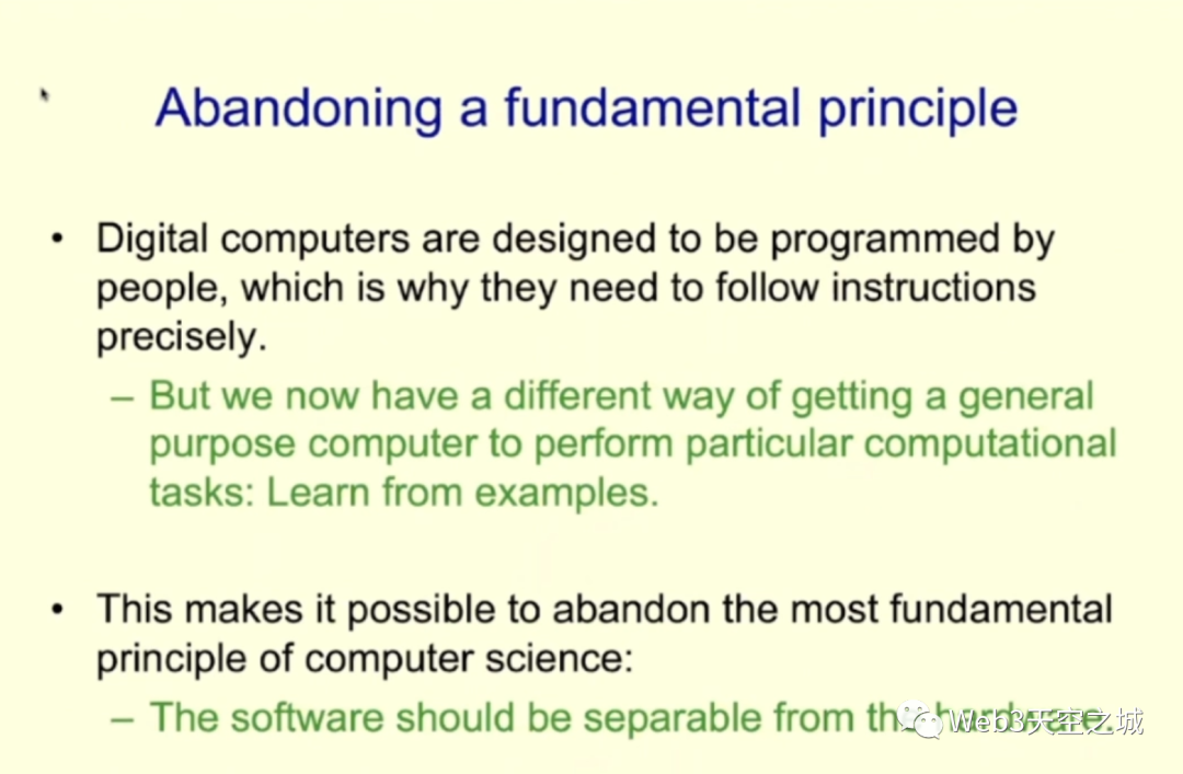 但这已经改变了,我们现在有一种让计算机做事的不同方式,那就是从例子中学习。我们只是向他们展示我们希望他们做什么,并且由于您让计算机做您想做的事情的方式发生了这种变化,现在可以放弃计算机科学最基本的原则,即软件应该与硬件分开。