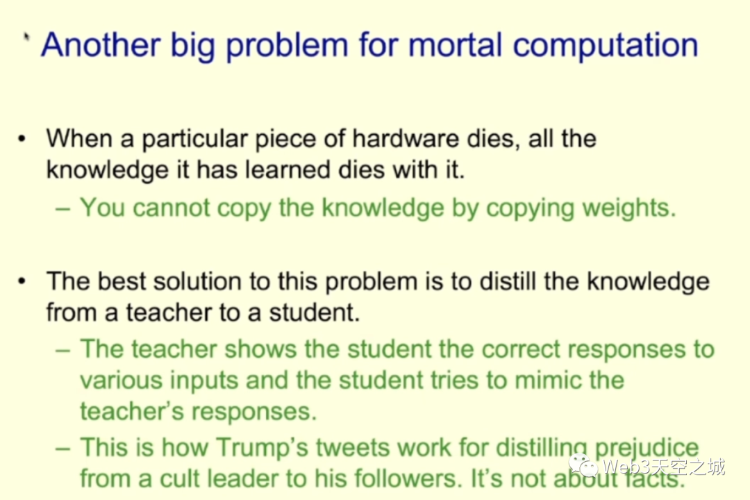 所以凡人计算的第二个大问题是它的生命有限性(Mortality)。当一个特定的硬件死掉时,它学到的所有知识也随之死去,因为知识和硬件的细节错综复杂地纠缠在一起。因此,该问题的最佳解决方案是在硬件失效之前,将知识从老师那里提取给学生。这就是我现在想做的。