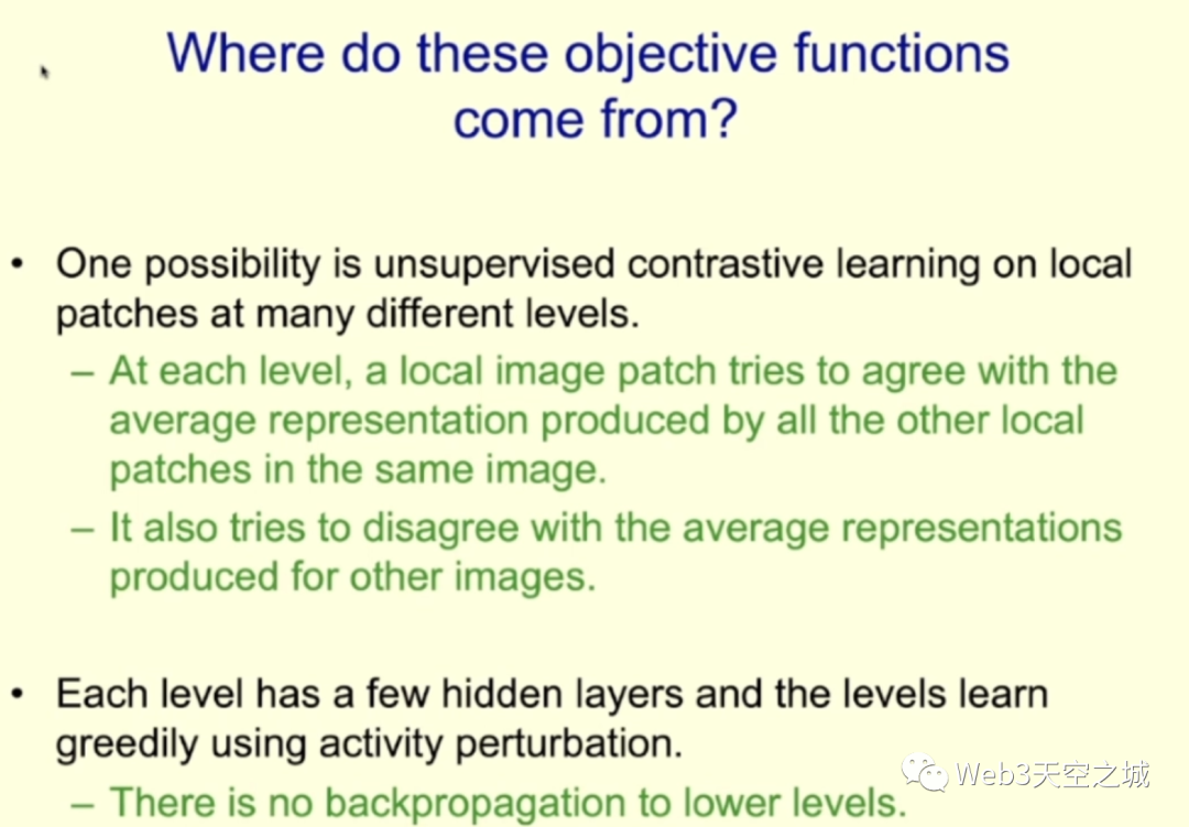 一种可能性是对局部补丁进行无监督学习,该局部补丁具有图像的多个表示级别,并且每个级别都有局部补丁。并在特定图像上制作每个局部补丁,制作该局部神经网络的输出,尝试与所有其他局部补丁产生的平均表示一致。因此,您试图在从本地补丁中提取的内容,与从同一图像中的所有其他本地补丁中提取的内容达成一致。
