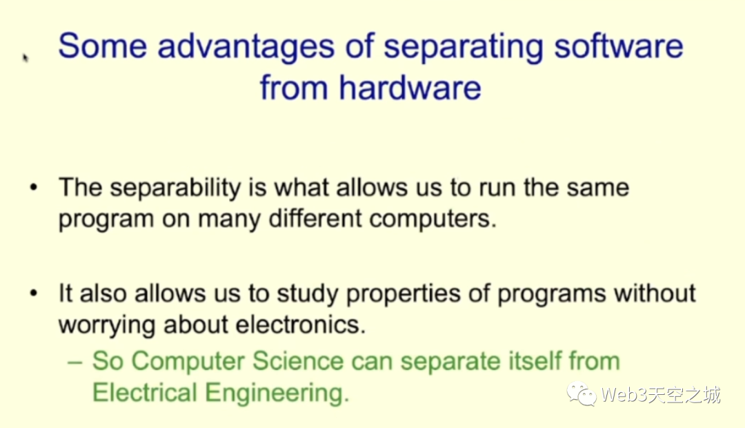 由于这种可分离性,我们可以在不同的硬件上运行相同的程序。我们还可以担心程序的属性,并在神经网络上研究程序的属性,而不必担心电子学,这就是为什么你可以拥有不同于电气工程系的计算机科学系。