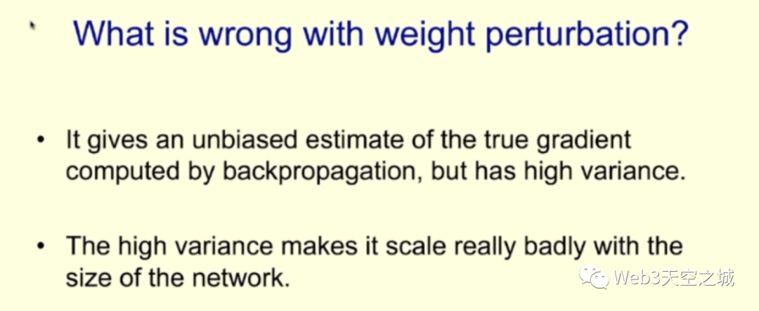 为网络中的每个权重生成一个由小的临时扰动组成的随机向量。然后你测量一个小批量示例的全局目标函数的变化。然后你通过改进的目标函数去缩放扰动向量,以永久地改变权重。