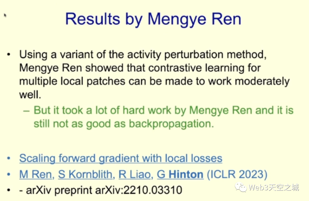 Mengye Ren 为使该算法发挥作用投入了大量工作,他证明了它可以适度发挥作用。它的效果可能比提出的任何其他算法都要好,这些算法可能是现实的,可以在真实的神经网络中运行。但是让它发挥作用很棘手,而且它仍然不如反向传播。当你使网络更深时,它会变得比反向传播更糟糕。
