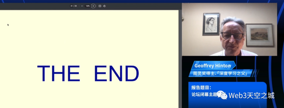 最后,Hinton放出PPT的最后一页, THE END,真是意味深长。。。作者寻思,是不是Hinton讲了那么多,最后一句,才是他真想说的...