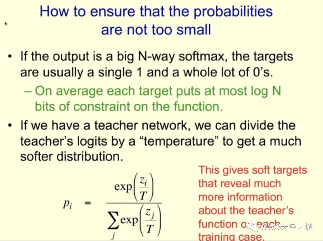 确保老师的输出概率都不小的方法是在高温下运行老师,并且在训练学生时也在高温下运行学生。所以你采用logits,这就是进入softmax的东西,对于老师来说,你按温度缩放它们,然后你得到一个更柔和的分布。你在训练学生时使用相同的温度,而不是在MNIST中使用学生,只是在训练学生时