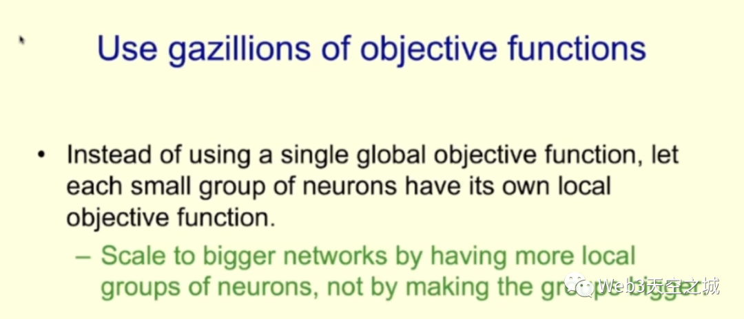 所以我们的想法是训练一个大的神经网络。我们要做的是有很多适用于网络小部分的小目标函数。所以每一小组神经元都有自己的局部目标函数。现在可以使用这种活动扰动算法来学习小型多层神经网络。它将以与反向传播大致相同的方式学习,但噪声更大。然后我们通过拥有更多小的局部神经元组将其扩展到更大的网络。