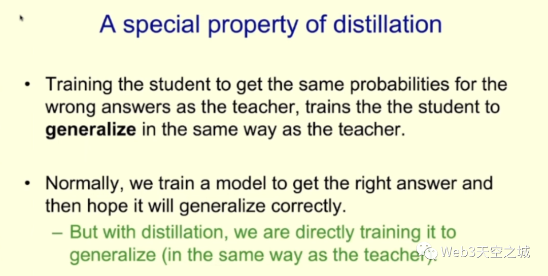 通常当你训练一个模型时,你训练它以获得关于训练数据的正确答案,然后希望它能正确地泛化到测试数据。你试着让它不要太复杂,或者你做各种其他事情,希望它能正确概括。但是在这里,当你训练学生时,你是在直接训练学生进行泛化,因为它正在被训练以与老师相同的方式进行泛化。