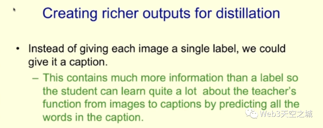 显然,您可以创建更丰富的蒸馏输出,而不是给标签一个图像,而是给它一个标题,然后训练学生预测标题中的单词,和老师一样。