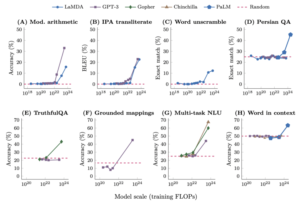 图2:摘自Wei等人(2022a):在语言大模型上评估特定任务或行为的表现通常不显示可预测的趋势,而且从资源消耗较少的模型版本过渡到资源消耗更多的版本时,往往会突现新行为。