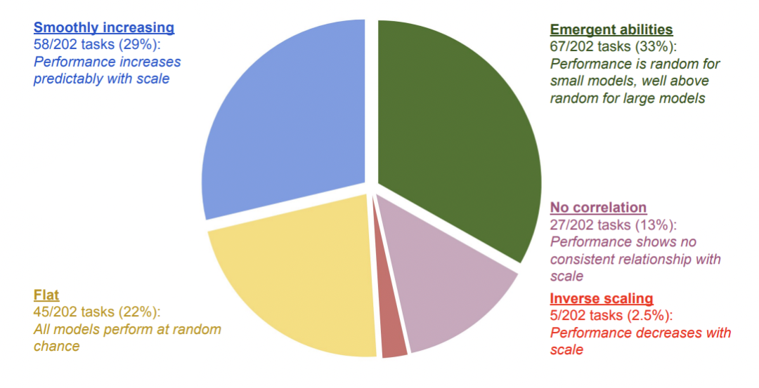 图3:根据Wei等人(2022a)的数据,由Jason Wei修改:在语言技术基准测试BIG-Bench(Srivastava等人,2022)中评估的202个任务,整体上随着规模的增加显示出改善的性能,但它们个别地可以逐渐改善、突然改善、保持稳定、变差或摇摆不定,这使得无法有把握地推断未来系统的性能。