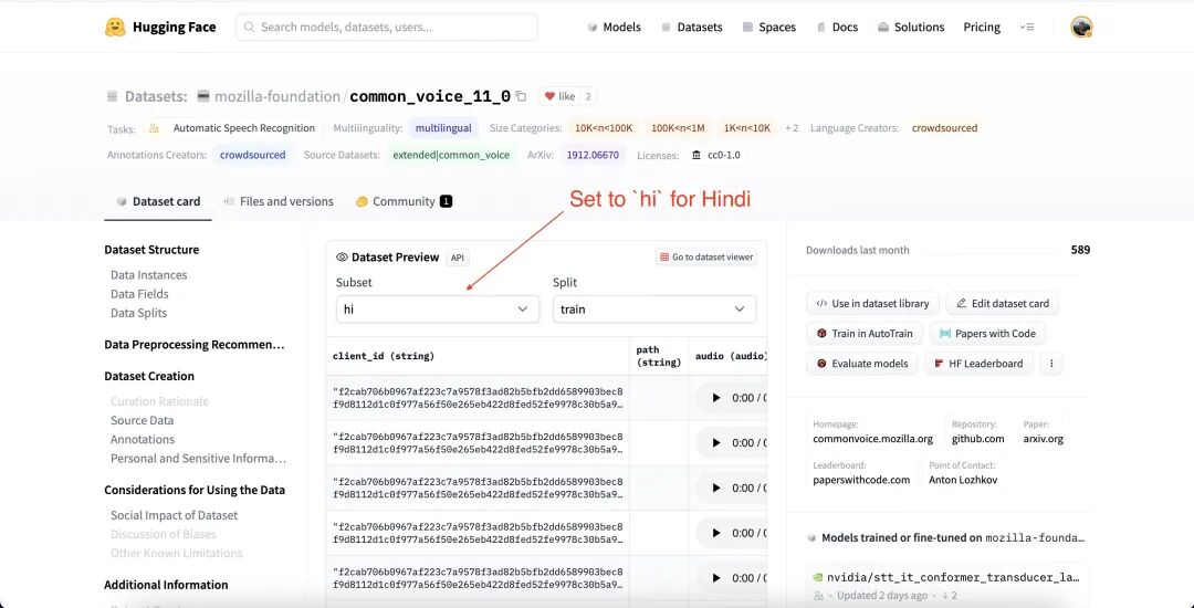 一旦身份验证成功,你就会看到数据集预览。数据集预览展示了数据集的前 100 个样本。更重要的是,它还加载了可供实时收听的音频。我们可以在下拉菜单选择 hi 来选择 Common Voice 的印地语子集 ( hi 是印地语的语言标识符代码):