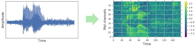 Whisper 特征提取器执行的第二个操作是将第一步所得的音频变换为对数梅尔声谱图。这些频谱图是信号频率的直观表示,类似于傅里叶变换。图 2 展示了一个声谱图的例子,其中 轴表示梅尔频段 (Mel channel),对应于特定的频段, 轴表示时间,颜色对应于给定时刻该频段的对数强度。Whisper 模型要求输入为对数梅尔声谱图。