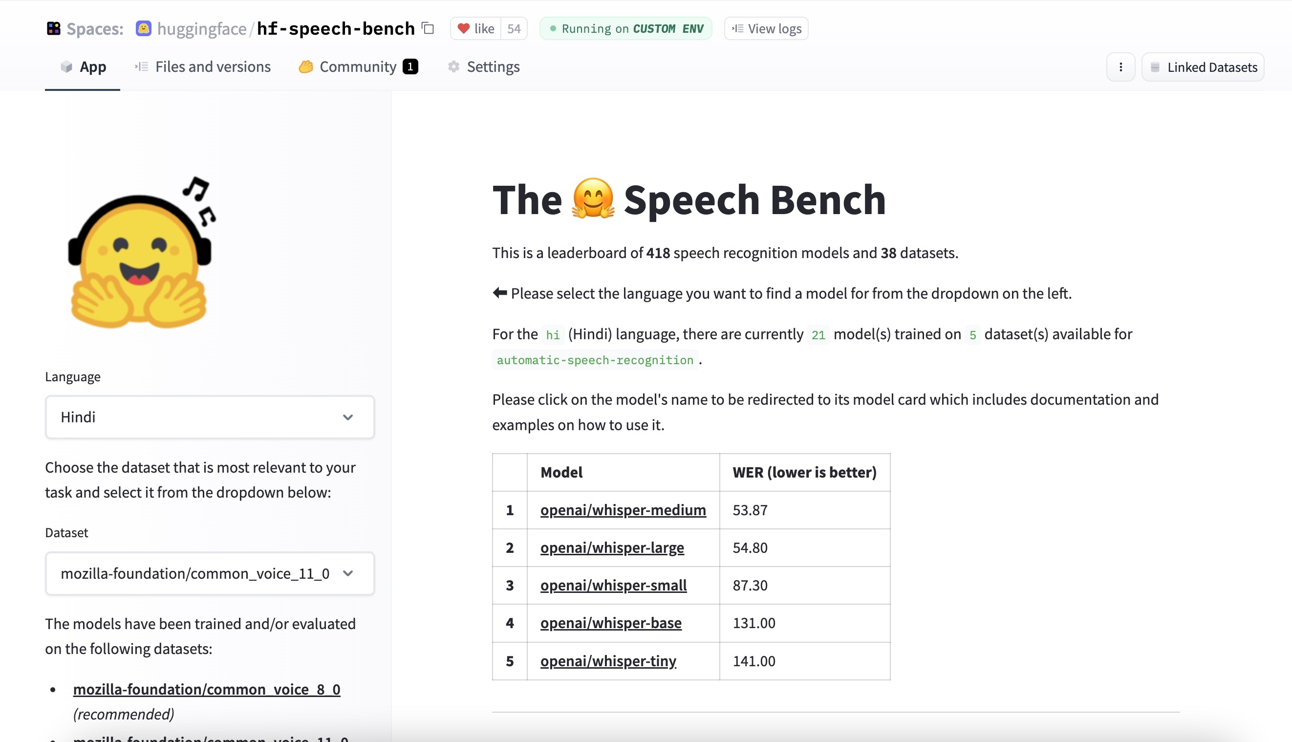 最佳 WER 是 32.0% —— 对 8 小时的训练数据来说还不错!那与其他 ASR 系统相比,这个表现到底处于什么水平?为此,我们可以查看 hf-speech-bench,这是一个按语种和数据集对模型分别进行 WER 排名的排行榜