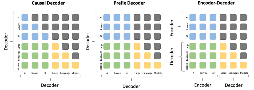 在预训练技术章节,我们大幅补充了大模型预训练各方面的技术细节。在模型架构部分,我们补充了三种主流模型架构的对比图 ,包括因果编码器、前缀解码器和编码器-解码器架构 ,从而直观的展示这三种架构的差异和联系。