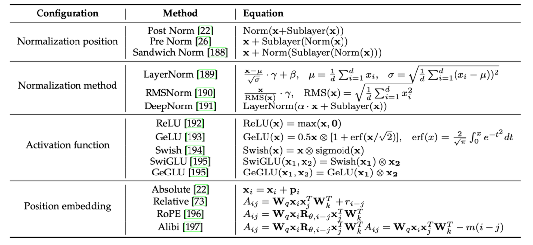 此外,我们详细补充了模型架构的各组件细节,包括分词、归一化方法、归一化位置、位置编码、注意力与偏置 等等,并提供了Transformer架构多种配置的详细公式表 。在最后的讨论章节,我们针对研究者广泛关注的长文本编码与生成 挑战进行了讨论。