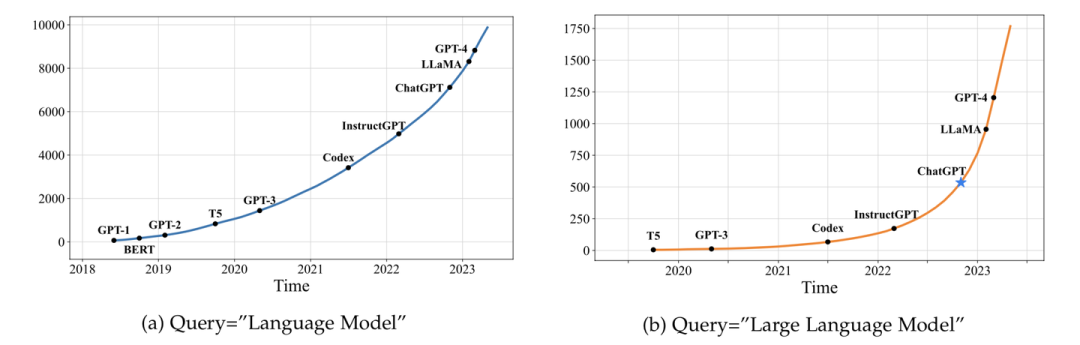 大语言模型目前已经成为学界研究的热点。我们统计了arXiv论文库中自2018年6月以来包含关键词"语言模型"以及自2019年10月以来包含关键词"大语言模型"的论文数量趋势图 。结果表明,在ChatGPT发布之后,相关论文的数量呈现出爆发式增长,这充分证明大语言模型在学术界的影响力日益凸显,吸引了越来越多的研究者投入到这一领域。