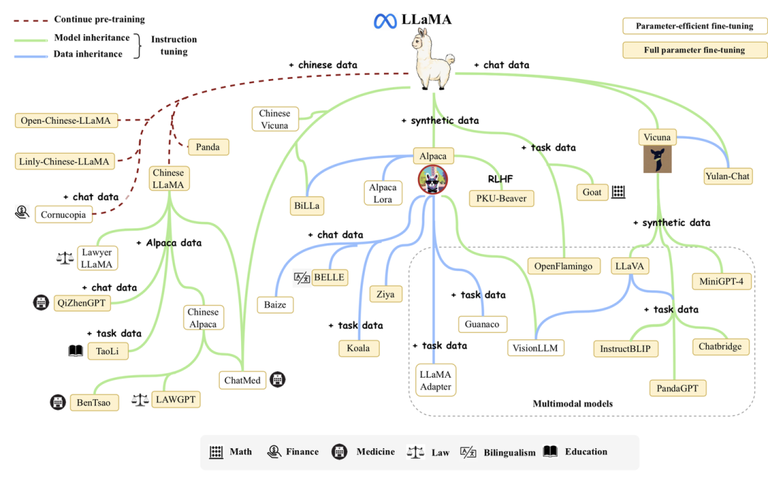 2023年2月,Meta发布了LLaMA大语言模型。受益于其强大的基座能力,LLaMA的发布引起了开源社区的对其进行扩展的热潮,大量的研究人员基于LLaMA进行指令微调或者继续预训练,从而催生了大量高质量的开源大语言模型。为了帮助读者了解LLaMA家族模型的发展脉络,我们增加了LLaMA家族模型的发展介绍 ,并绘制了一个简要的LLaMA家族演化图 来展示LLaMA家族模型的发展历程,以及各个衍生模型之间的关联。