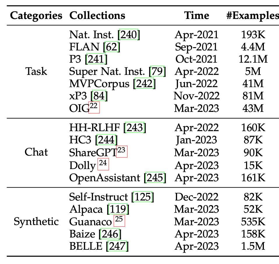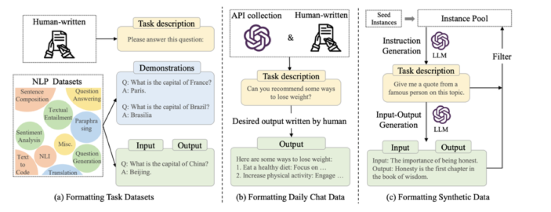 在适配技术章节,我们扩充了指令微调 的技术细节,包括指令收集方法、指令微调的作用、指令微调的结果和对应分析。首先,我们按照任务指令、聊天指令、合成指令 三类分别介绍了指令数据的收集方法,并收集了的指令集合 。