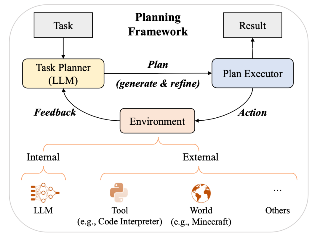 除了上下文学习和思维链提示,我们还介绍了另一类使用大语言模型的重要范式,即基于提示对复杂任务进行规划 。根据相关工作,我们总结出了基于规划的提示的总体框架 。这类范式通常包含三个组件:任务规划者、规划执行者和环境。随后,我们从规划生成,反馈获取和规划完善 三个方面介绍了这一范式的基本做法。