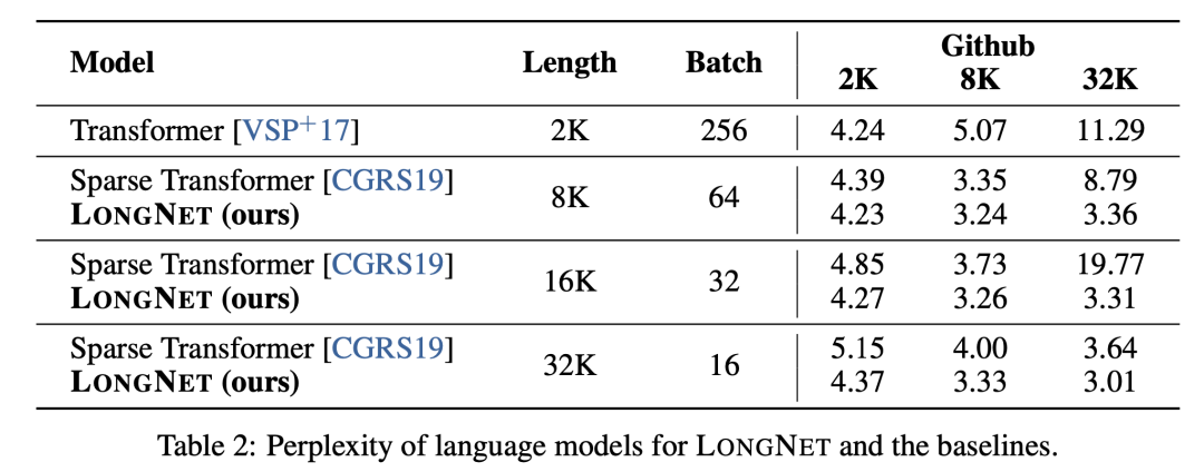 从下面两张图中可以看到,LongNet的PPL分数明显低于标准Transformer。在相同建模序列长度中,LongNet表现均优于Sparse Transformer。相对于标准Transformer而言,LongNet可以用更小的计算量,建模更长的上下文范围,取得更好的表现。