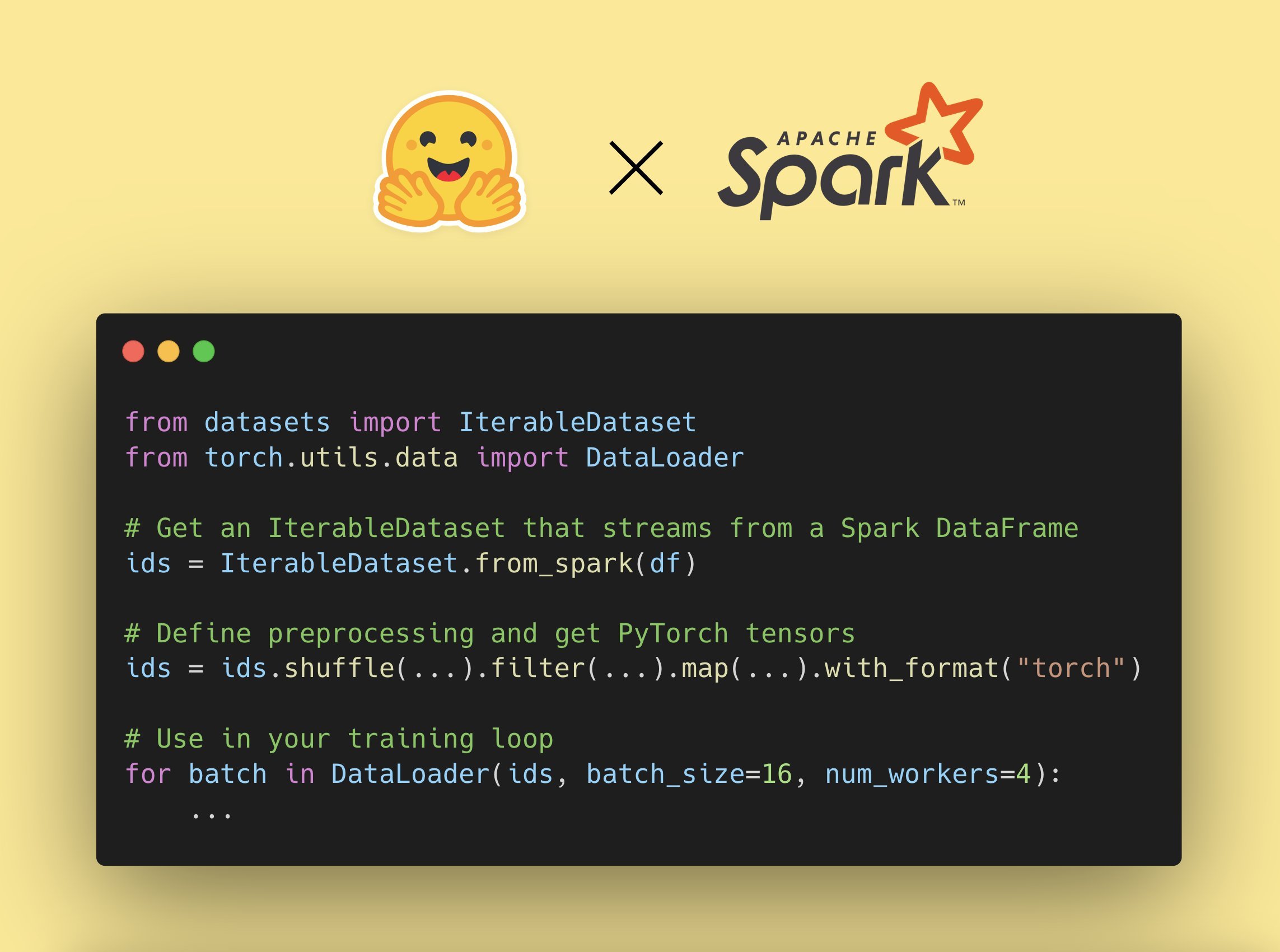 Hugging Face Datasets 是一个可以轻松访问和共享用于音频,计算机视觉以及自然语言处理等任务的数据集的库,帮助你用一行代码加载数据集,并用我们强大的数据处理功能迅速处理好用于深度学习模型训练的数据 🚀。Datasets v2.13 版本具备直接从 Apache Spark 进行数据流处理的能力,也引入了对各种数据格式的更快速流式处理能力,包括 Parquet、JSONL、图像、音频等等 🎉。