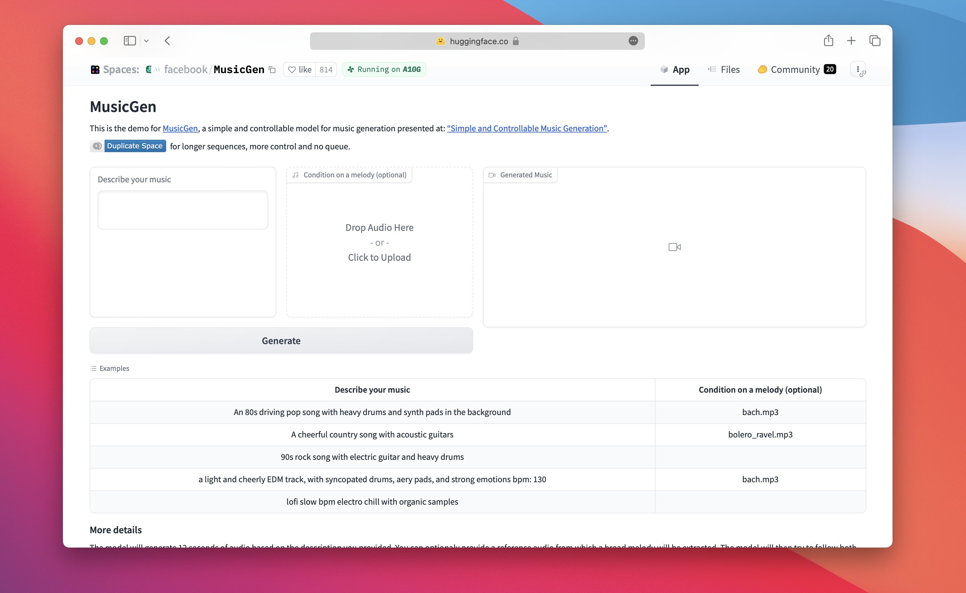 MusicGen 用户可以控制音乐的节奏、调性、乐器、风格等,从而根据自己的喜好和创作需求,个性化地定制生成的音乐 🎹🎶。MusicGen 简单实用并且易于控制,发布后便成为 Hugging Face 上最受欢迎的项目之一 😍。