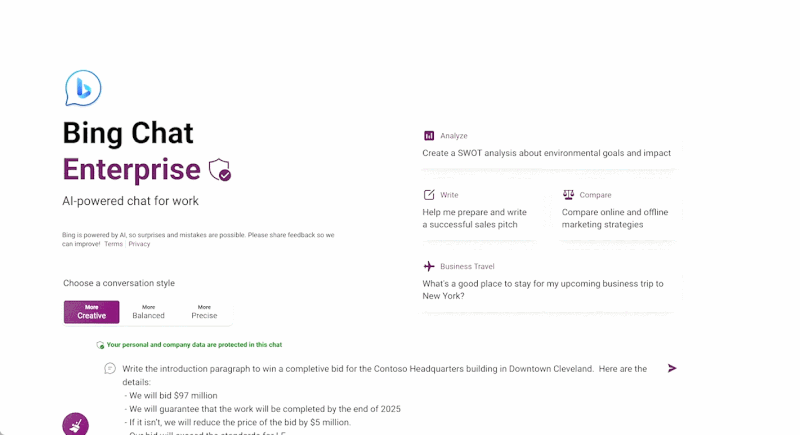 企业版 Bing Chat 不仅可以完成相对专业类型的工作,可以帮助人们提升工作效率,而且聊天数据不被微软访问,且不会被用于训练模型。